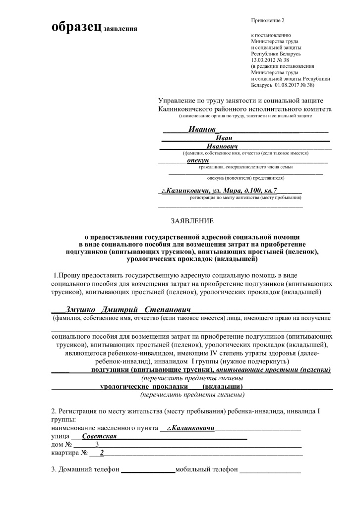 Образец заявления о предоставлении государственной адресной социальной помощи в виде возмещения затрат на приобретение подгузников (впитывающих трусиков), впитывающих простыней (пеленок), урологических прокладок